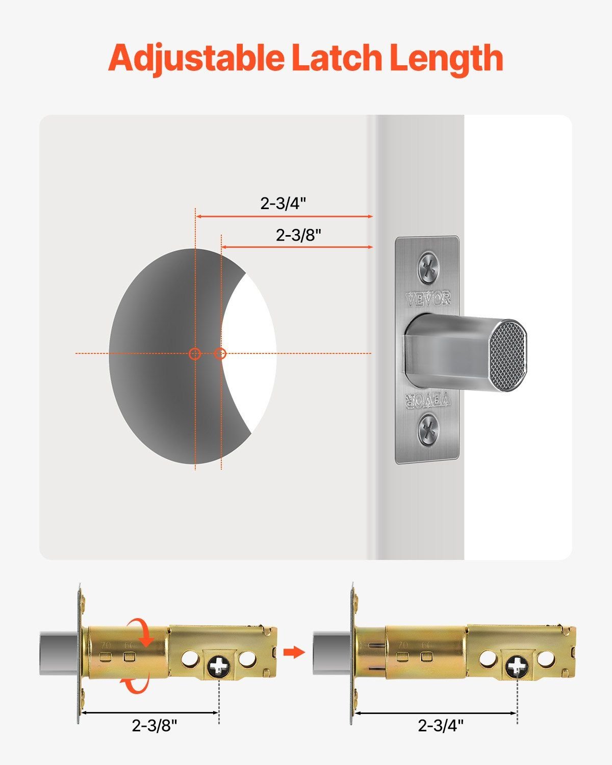 2.Adjustable Latch Length: The latch length of the dead bolt lock can be adjusted between 2-3/8 inches and 2-3/4 inches, ensuring an ideal fit for both new door installations and replacements on existing doors